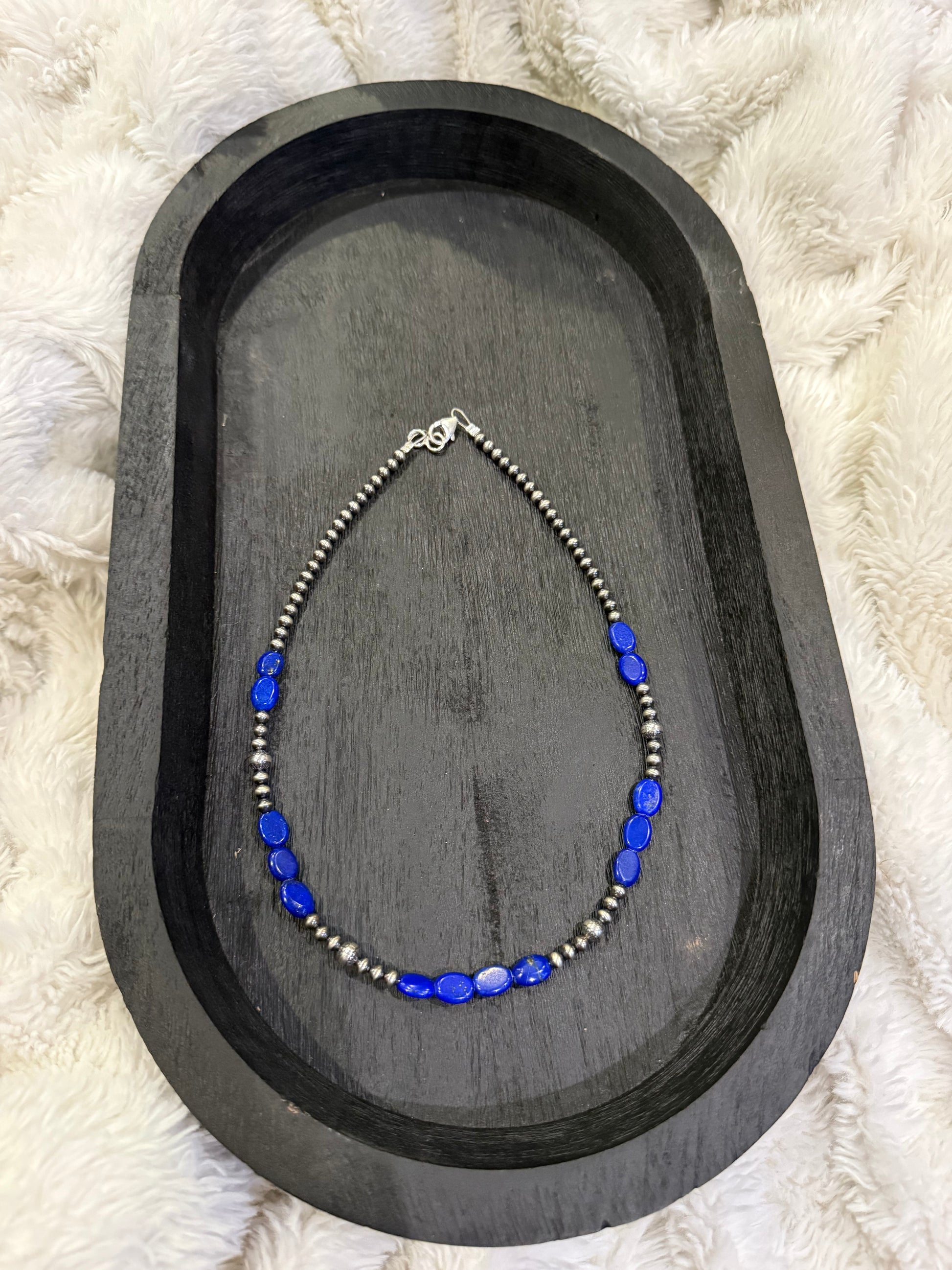17 1/2 inch 4mm pearls & 6mm floral stamped pearls with blue lapis