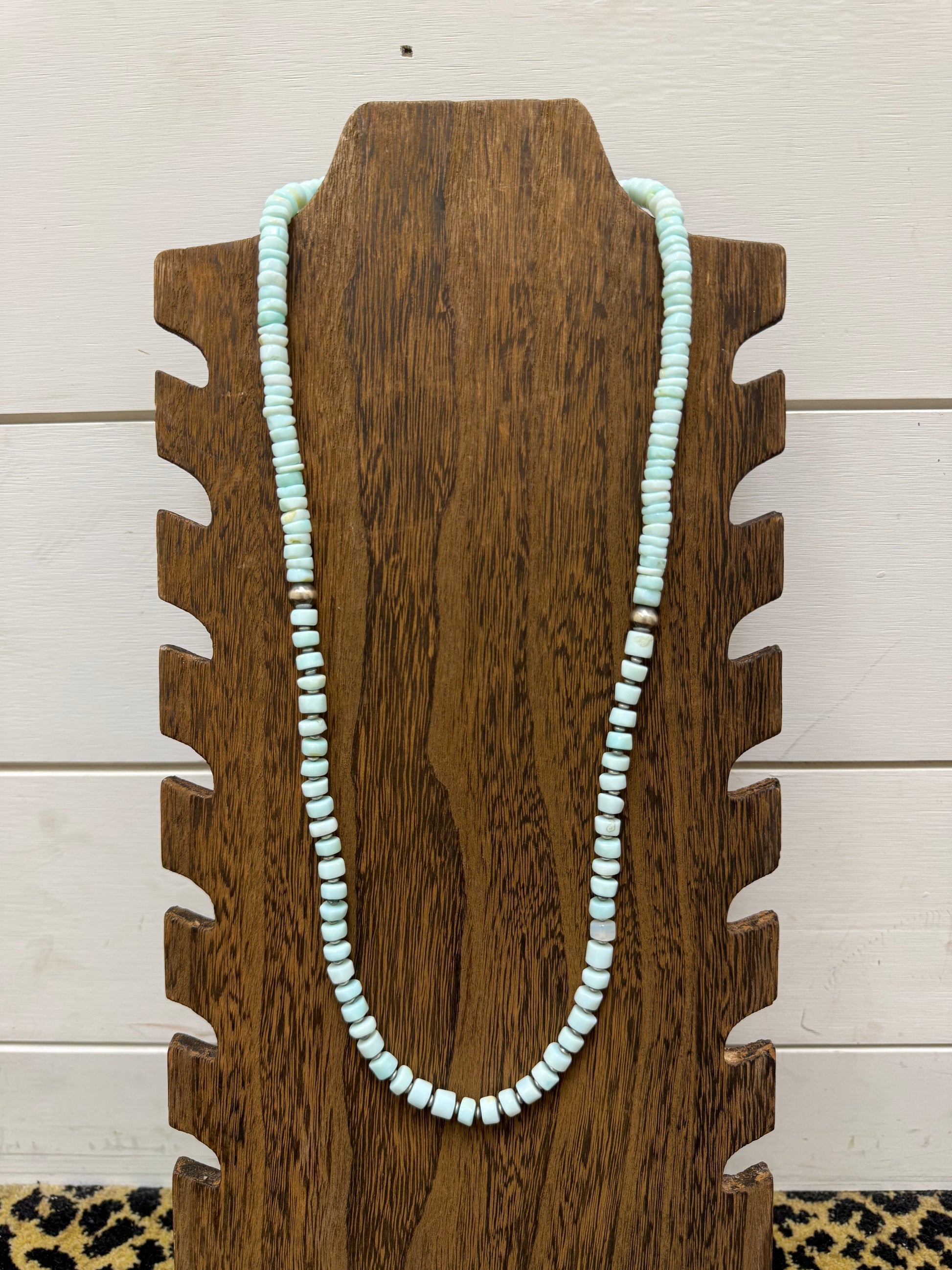 26 inch 3mm saucers & 8mm pearls with blue opal