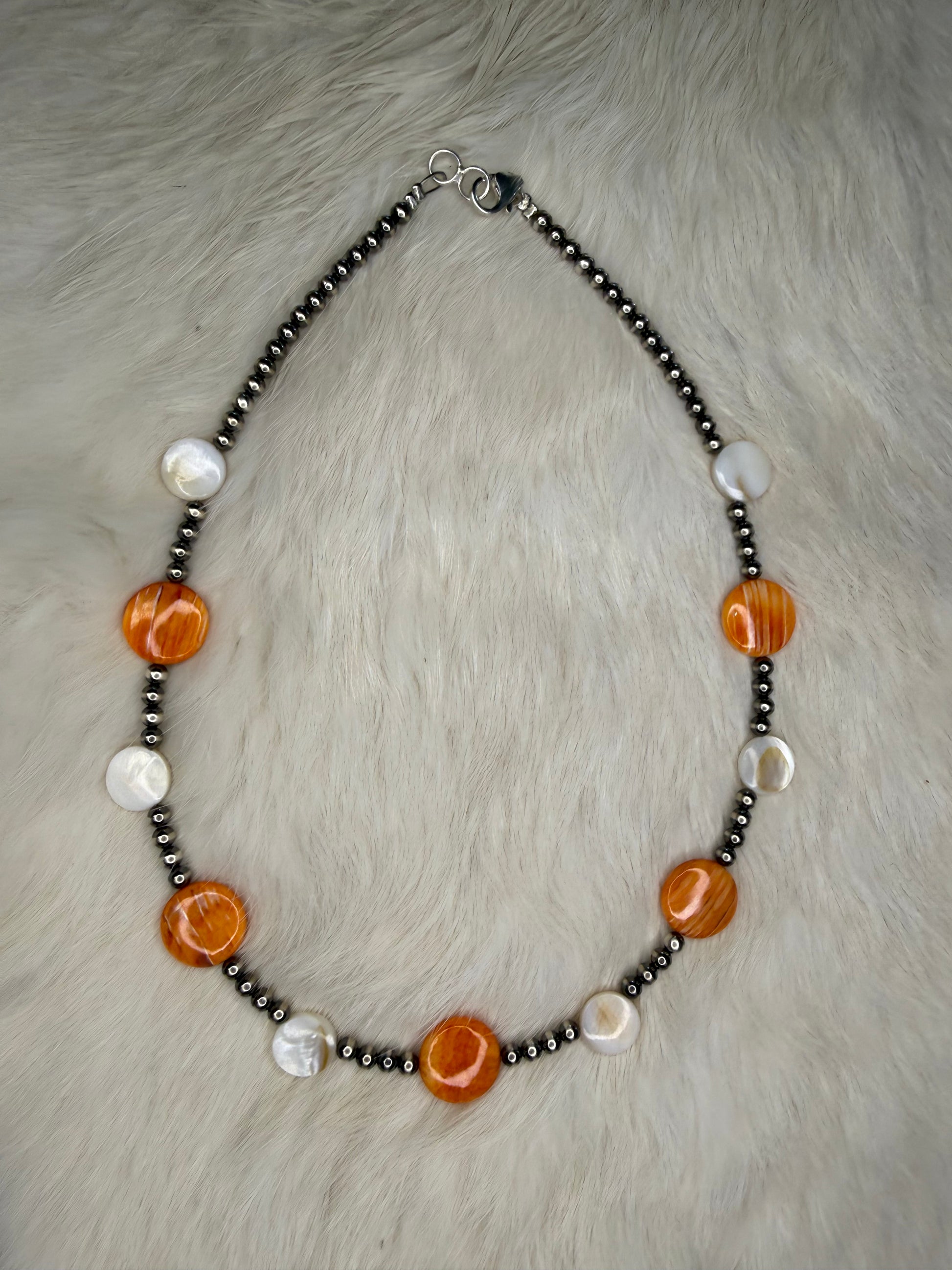 17 1/2 inch 4mm pearls with orange spiny and mother of pearl