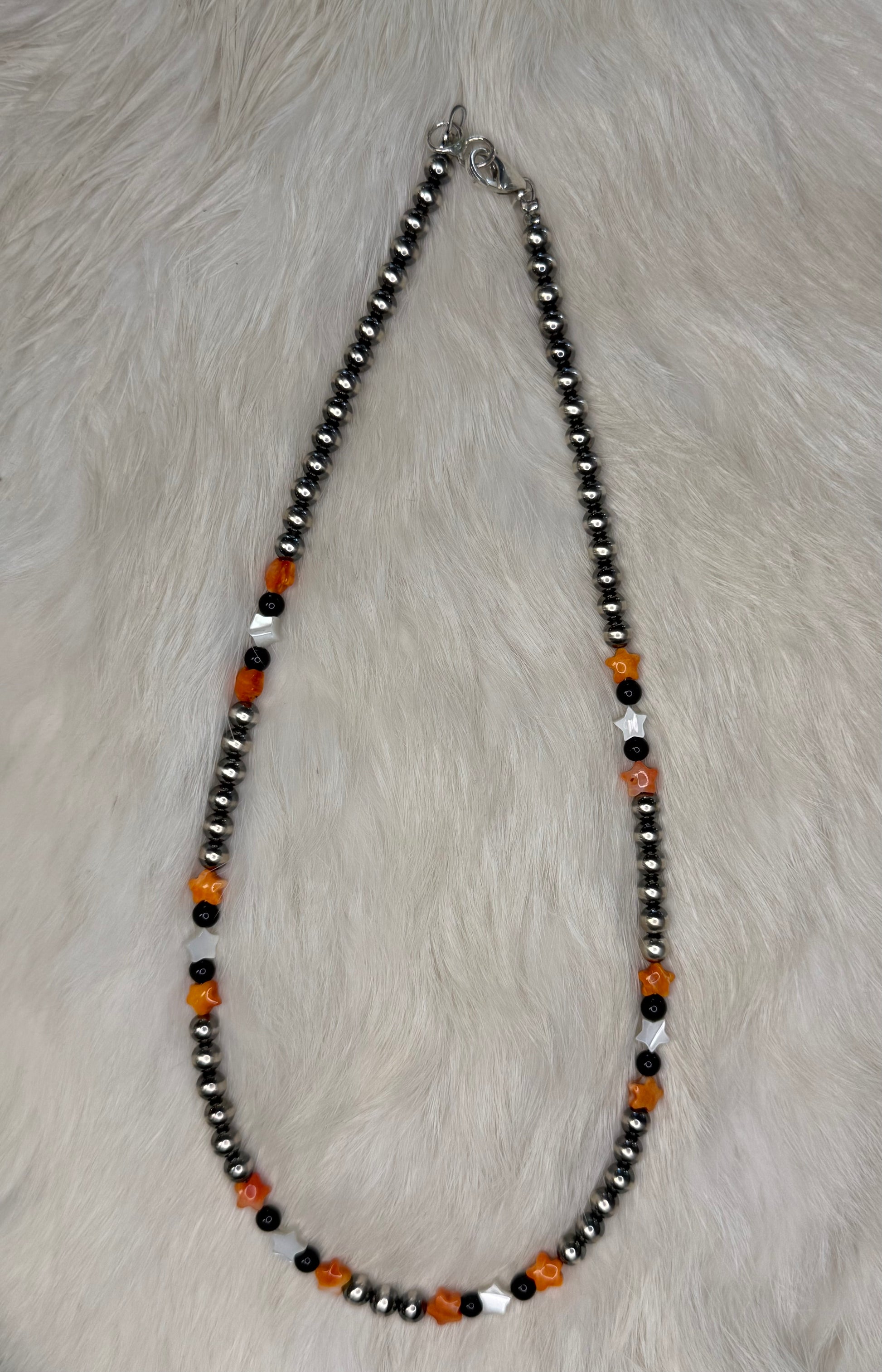 18 inch 5mm pearls with orange spiny oyster, mother of pearl, and black onyx