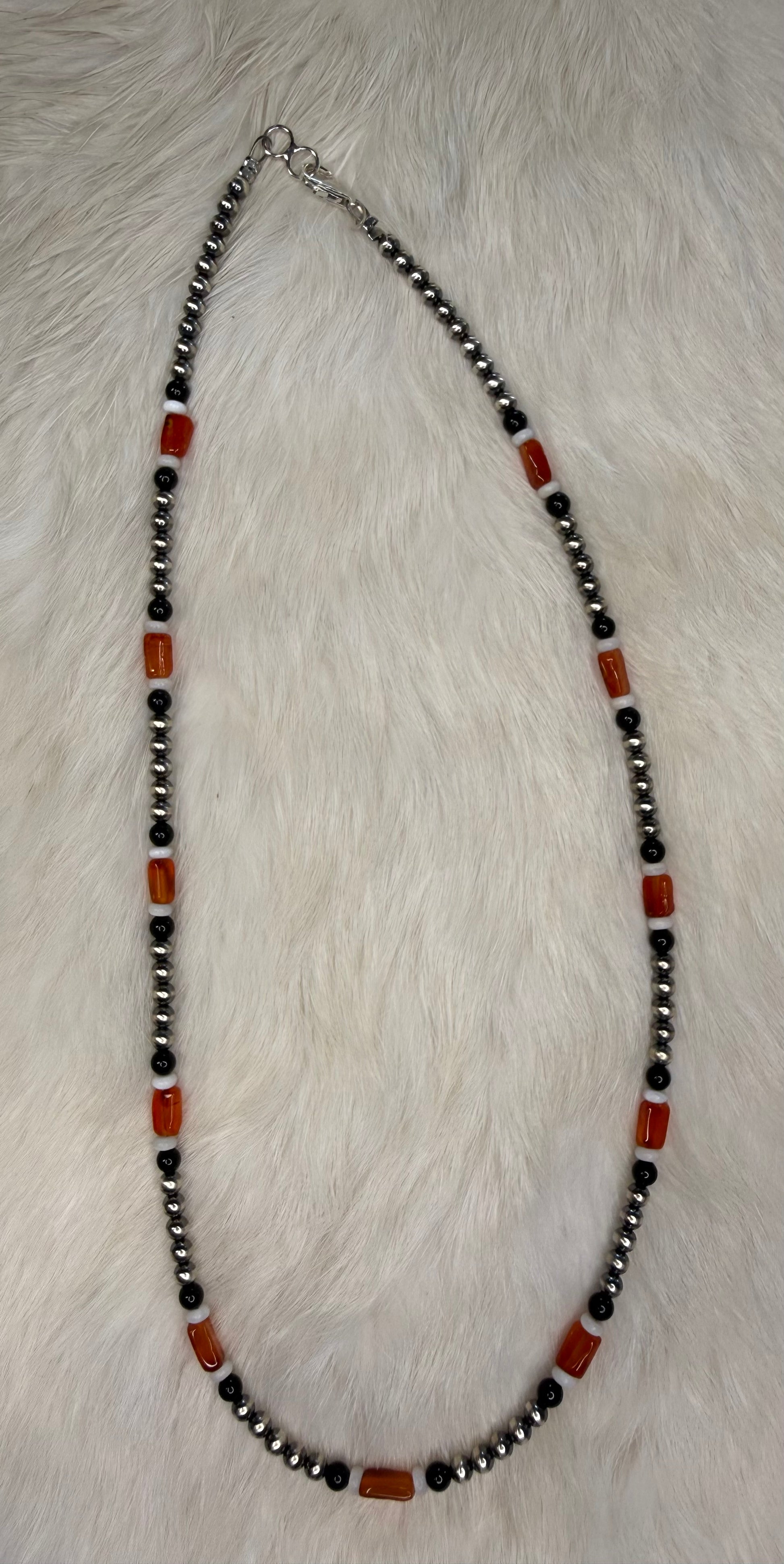 21 inch 4mm pearls with black onyx, white spiny oyster, and agate