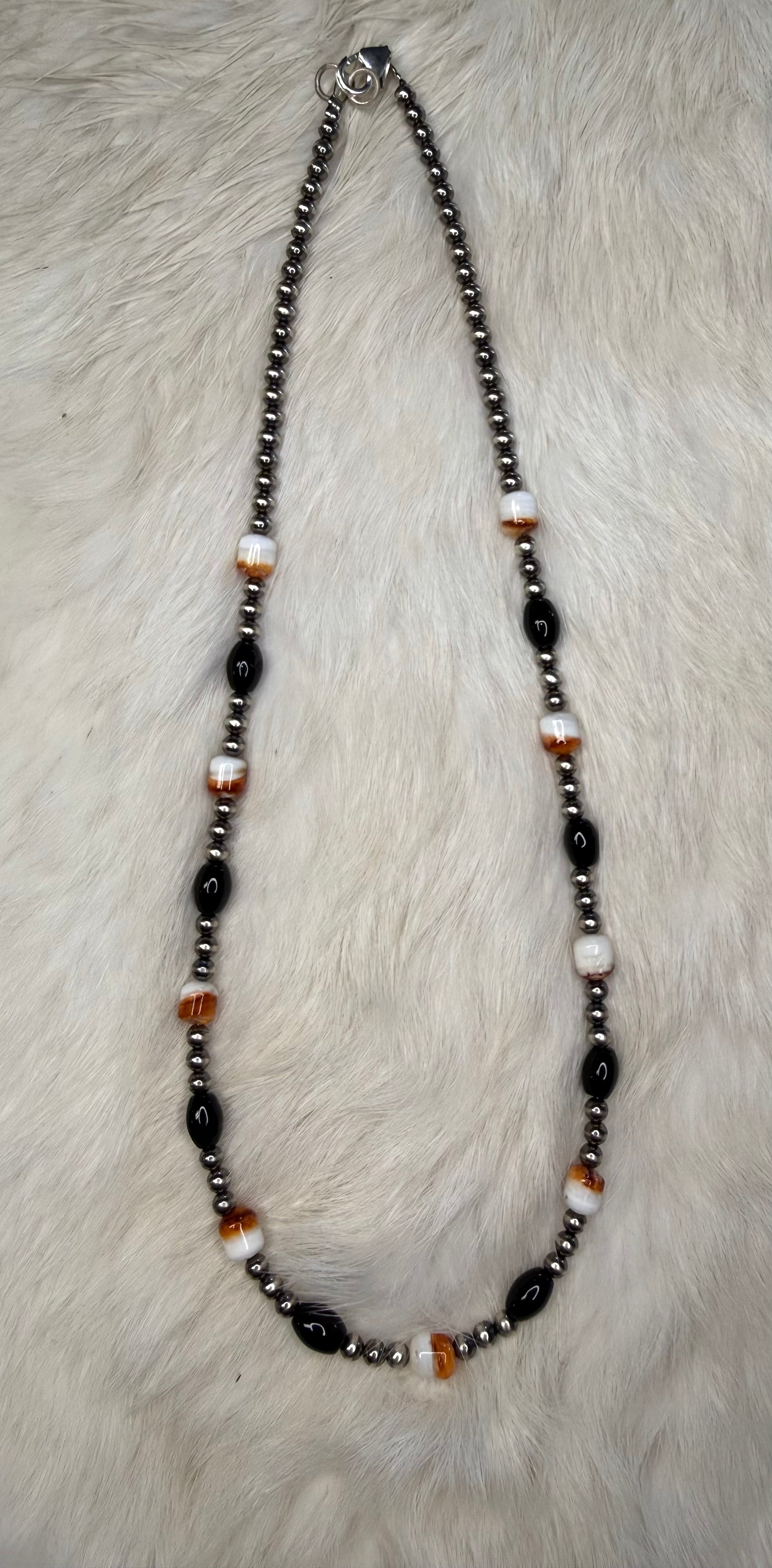 20 inch 4mm pearls with orange spiny oyster and a black composite